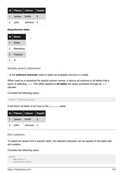 To select all values from a specific table, the wildcard character can be applied to the table with